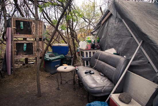 Mao’s commitment to chipping away at the problem of homelessness in Lowell goes beyond the youth who come to UTEC for assistance. He frequently visits shelters and other hotspots around the city, checking in with previous acquaintances young and old, offering basic hygiene products and food supplies, and making new connections. For some, home is found in semi-permanent collections of tents near rivers, woods, and bridges around Lowell. These tent cities, many of which have been or will soon be removed, have been home to some residents for many years. Now many sites lie abandoned, the residents having left ahead of city efforts to clear them out. A walk through these partially abandoned homes reveals images both sad and uplifting, everyday and sublime: a trampoline with a gorgeous river view; partially charred family photos; pet rabbits in orderly hutches, with an extra constructed for donation to the animal shelter; and ingenious repurposing, recycling, and reusing.