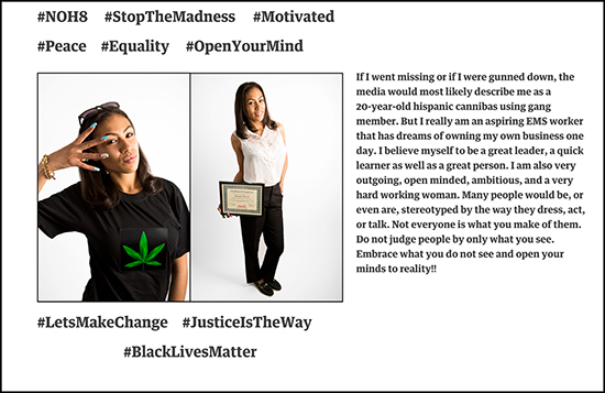Pushing back against stereotypes and demanding that society becomes more visually literate, students in the workshop created their own campaigns and hashtags using the If They Gunned Me Down campaign as an example. Each student planned clothing, props, facial expressions and body language for their own “dueling” portraits and wrote the accompanying text.