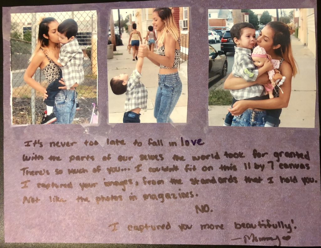 Mother, Me is a participative storytelling project using photography, embroidery, writing, and skill sharing to explore personal ethnographies, counter-narratives, and ideas of motherhood. The project is an ongoing collaboration between 2016-2017 Lewis Hine fellow Jenny Jacklin Stratton and the young mothers in residence at Zoe’s Place-a program of Children’s Aid and Family Services of New Jersey designed to provide safe housing and support for pregnant teens, teenage mothers and their children.